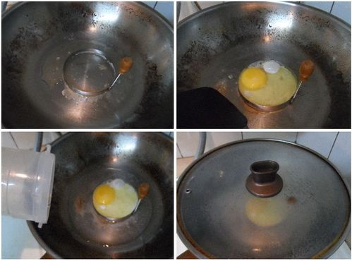 3.待蛋底稍為凝固,急於鍋內蛋環旁倒入水